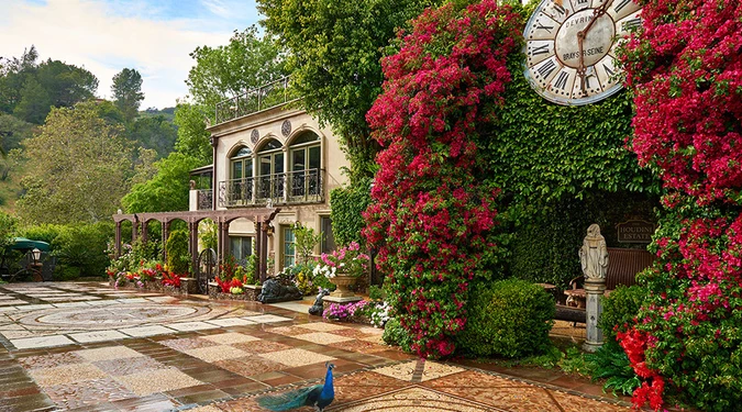 This hillside estate in Laurel Canyon was built in 1915 and is named after legendary magician Harry Houdini, who stayed on the property with his wife Bess while filming movies in Hollywood in 1919. The estate features terraced gardens, stone staircases, caves, and a pool where Houdini reportedly practiced his underwater escape routines. It has appeared in various music videos, commercials, and independent films. Its mystical atmosphere and secluded canyon setting make it ideal for fantasy sequences, music performances, and intimate dramatic scenes. Located at 2400 Laurel Canyon Blvd in the Hollywood Hills, it’s best suited for fantasy/mystical scenes, music videos, and secluded luxury settings.